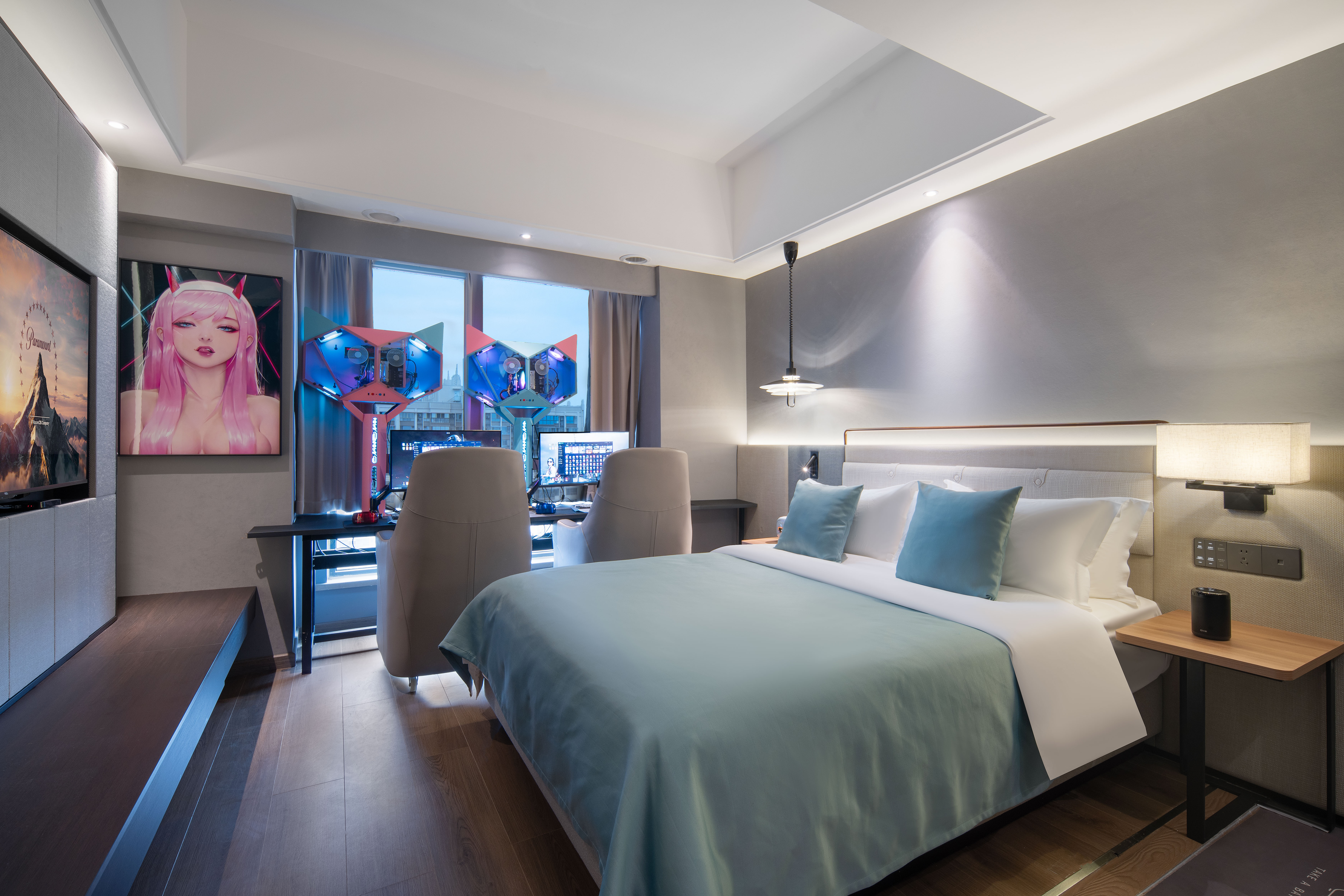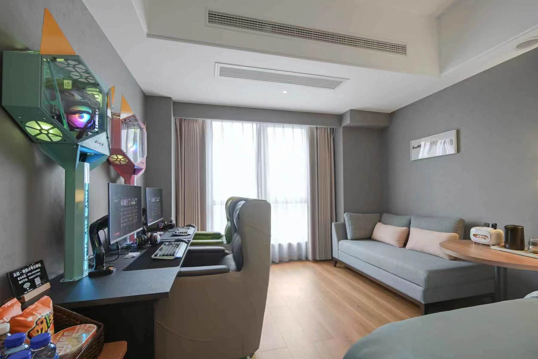 本店以新颖时尚的设计风格恰到好处的阐释了轻奢酒店与电子竞技的理想结合来打造玩家现代潮流与舒适体验的电竞酒店为宗旨。推出双人、3人、4人间等多种住宿组合选择,电脑设备12代i5CPU+32G内存+3060/3070显卡(LOL 全英雄全皮肤)27寸2k-180HZ(360度升降旋转)及专业电竞设备。同时,本店是智能型民宿,开关灯,空调,窗帘,只需您一声"小度小度"就可以轻松实现。以极简+智能为线索,在刻意强调舒适性的前提下,为玩家精心打造了一个动线极其流畅,感官极其舒畅的高空竞技空间。新风系统,满足您对理想电竞空间的所有幻想。每间房提供一辆车24小时免费停车一次(特惠房除外),免费早餐。