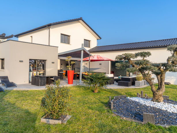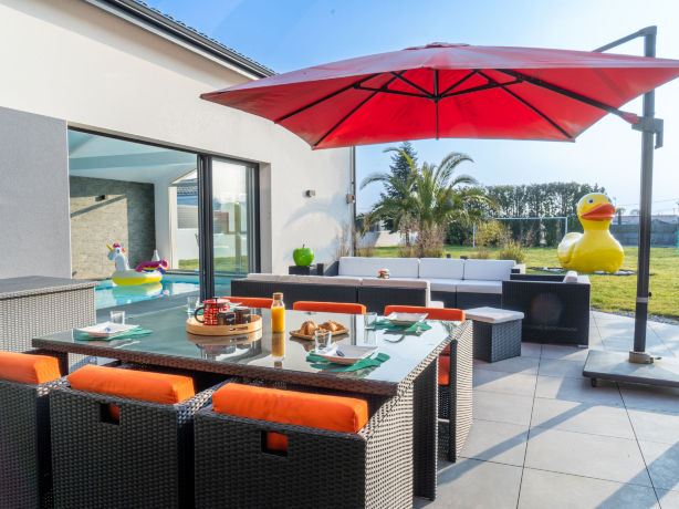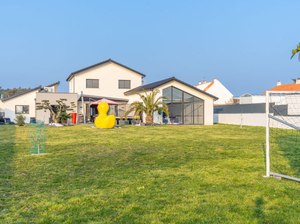 Very modern, beautiful villa "La Villa des Dames", 2 storeys, built in 2017. In the resort 9 km from the centre of Pornic, 2.5 km from the sea, 4 km from the beach, south-west facing position. Private: large, well-kept garden 2'400 m2 (fenced), indoor pool heated, with privacy (9 x 3 m, depth 120 - 150 cm, seasonal availability: 01.Jul. - 02.Sep.) with shutter cover and alarm system. Shower/WC in the pool area, boules, terrace (80 m2), garden furniture, barbecue. In the house: fitness room, playroom, table football, burglar alarm system. Single garage. E-charging station. Supermarket 600 m, 9 minute walk to the centre, railway station "Bourgneuf-en-Retz" 350 m, sandy beach "Plage du Pre Vincent" 4 km, thermal baths "Alliance Pornic Thalasso & Spa" 11 km. Sports harbour 14 km, golf course (18 hole) 15 km. Nearby attractions: Pornic 9 km, Planète Sauvage 18 km, Ile de Noirmoutier 43 km, Les Machines de l'Ile de Nantes 43 km. 7-room villa 280 m2 on 2 levels, south-west facing position. Modern and luxurious furnishings: large living/dining room with TV (flat screen). 1 large room with Dressing room with 1 french bed (1 x 180 cm, length 200 cm), bath/shower/WC and TV (flat screen). Open kitchen (oven, dishwasher, 3 induction hot plates, toaster, kettle, microwave, electric coffee machine, Capsules for coffee machine (Nespresso) extra, steamer, cooking island). Sep. WC. Upper floor: 3 rooms, each room with 1 french bed (1 x 160 cm, length 200 cm). 1 room with 2 beds (90 cm, length 190 cm). 1 room with 2 beds (90 cm, length 200 cm). 2 showers, sep. WC. Air-conditioning, underfloor heating. Facilities: washing machine, dryer, safe, iron, mosquito net, hair dryer. Internet (WiFi, free). Reserved parking (fenced 4 cars). E-charging station. Please note: non-smoking house. Smoke alarm. Offer by a private individual according to? Art. 155, IV of CGI. 44021000005RI